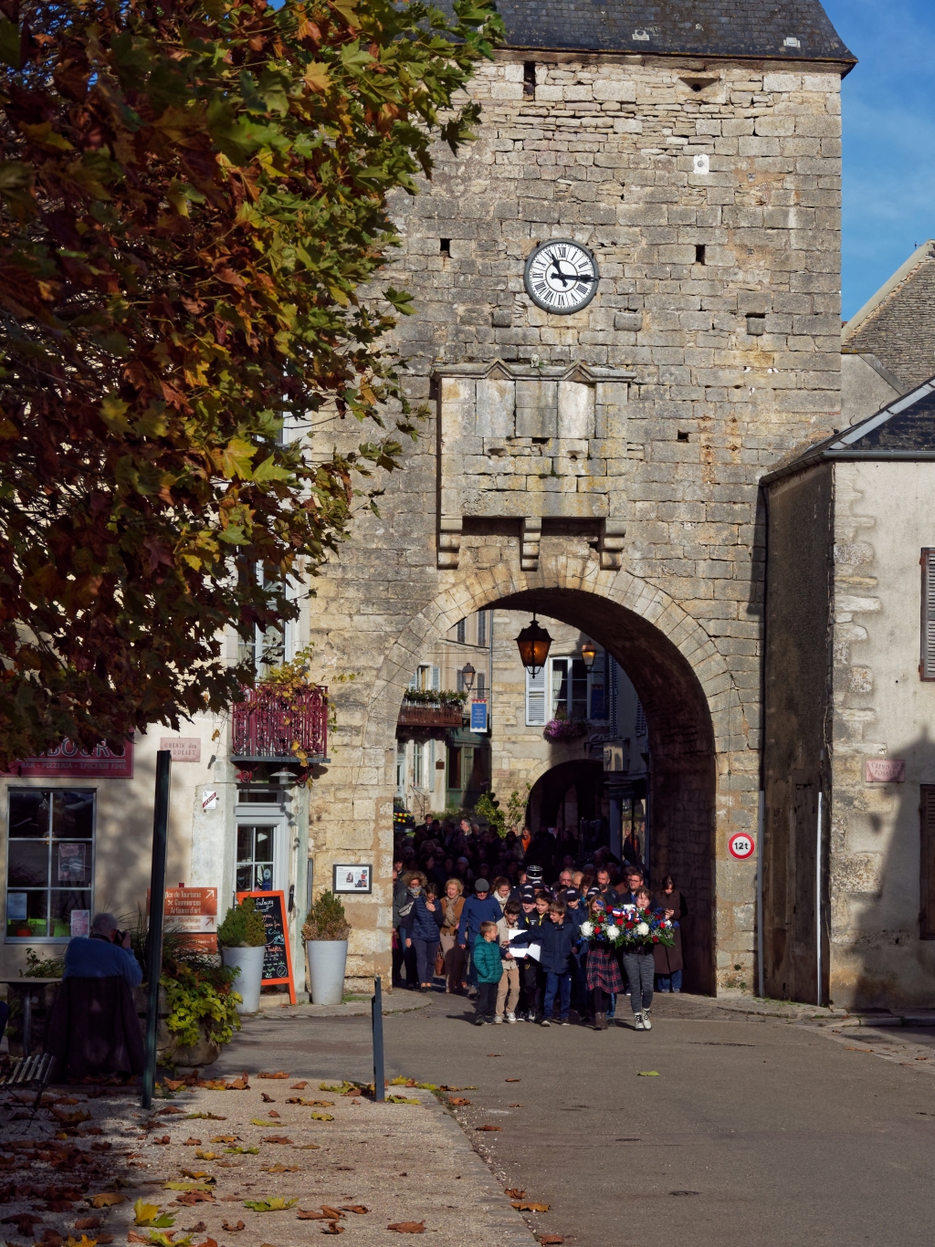 Much as we like Entre-deux-Eaux, it is never likely to be listed among the most beautiful villages of France. On 11 November, which is a public holiday in France, while we were taking a short break in Burgundy, we parked outside Noyers-sur-Serein which is a member of Les Plus Beaux Villages de France Association just before two girls with wreaths of red and white flowers led a procession of officials and inhabitants out through the old gateway to the war memorial. The emptied mediaeval village with its cobbled streets, timbered houses, wrought iron and ceramic signs and carved beams was a photographer’s paradise, with a couple of old Renault 4 cars thrown in for picturesque effect. After climbing uphill towards the site of the old castle and admiring the view, we descended a steep passageway gingerly, followed a backstreet, looked round the church and its misericords, then headed for a coffee. The Mairie door was invitingly open, and from the festive sounds within, we deduced that the procession had returned and was drinking to the village’s war-dead. We sat down outside Mimi’s cafe facing the Mairie. Mimi patted his shaggy dog, adjusted his slouch hat and disappeared into the bar to make coffees.