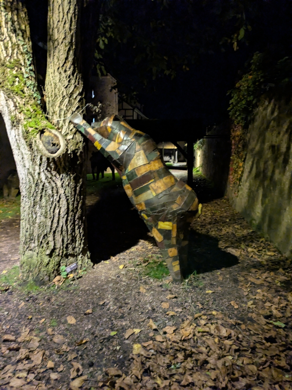 We stayed overnight in a comfortable traditional hotel, the Saint Nicolas, within the walls of Riquewihr. When the rain lifted in the evening we had a pleasant stroll round the quiet cobbled streets (all the daytime tourists had magically disappeared). The metal animal sculptures outside the walls looked surprisingly menacing in the dark. After breakfast next morning (the croissants ran out – unheard of in France!) we paid a short visit to the famous Christmas shop on the corner of the street. No-one wants an angel without arms, and our glass angel for our Letchworth Christmas tree had broken beyond repair. We surveyed the arrays of angels in glass, straw, terracotta and faïence, with trumpets, cymbals, violins or harps, and selected a simple one, before driving home to E2E in heavy rain.