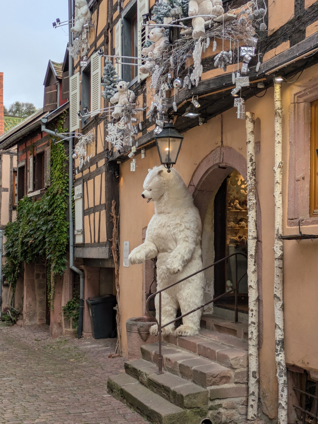 Now, as Christmas approaches, the windows, houses and shops in Alsace will be decorated with white bears of all sizes, joining October’s large furry polar bear in Riquewihr. Village friends tell us that nonnettes are a Christmas delicacy here as well. And we must not forget to pack our angel from the Christmas shop in Riquewihr before we set out on December 12 for the UK.